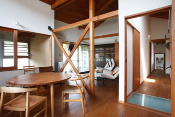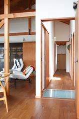 階段の一部はサンプルで遊びました。 パッチワークになったココナッツ素材。 画像下左 生活の場からアトリエを見ています。 扉が開いた状態。 画像下右 生活の場からアトリエを見ています。 扉が閉まった状態。