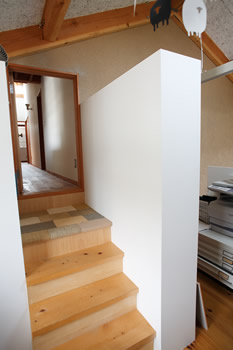 中二階がアトリエなので、さらに数段上ります。 アトリエの打ち合わせの場からは この階段が意識できないようにしました。