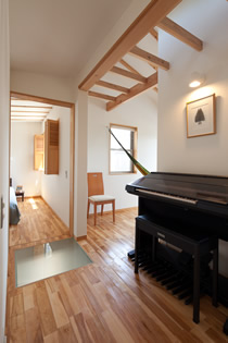 画像左: 二階の廊下にガラスが埋まっています。 昼間は自然光が夜は照明がフットライトに。 廊下も電子ピアノを置いて使う場に。