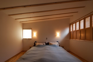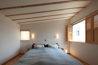 今までの仕事 -大磯 ハンモック・サーフィン・中庭の家-05 二階は寝室などの個室があります。 一階の開放性と二階のプライヴァシー。二階は屋根のこう配に応じて、色んな高さの天井が楽しいですね。 風が通って光がわたる家。そして、 これからの可能性がぎゅうっと詰まった計画になっています。