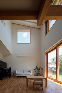 明るくて気持ちのいい風が流れている。窓の外には青空と雲ぽっかり。ご主人が休みごとに頑張った芝の庭が、さらに魅力を増しています。