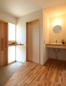 画像上左: 親世帯の風呂場。 檜を貼った壁で ハーフユニットバスです。 キッチンと洗面と一直線。 一階にあって バリアフリーです。 画像下左: 子世帯の玄関 帰ってすぐに手を洗う。 部屋にしてしまうと なかなか行かない場所になって 清潔に保つのも気が回らない。 話をしながら動線の中で 用が足せるのがイイ。