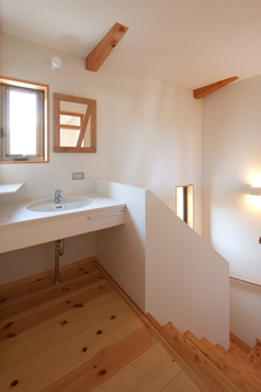 画像下右: 子世帯二階のホール。 手を洗ったり 顔も洗ったり出来る洗面台。 色んな使い方が出来るように 想定をしています。 ここも同じように動線の中。