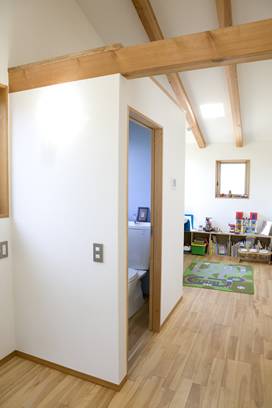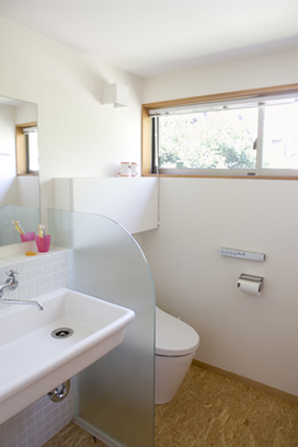 画像:上左 トイレと洗面を兼ねてます。 洗面台は洗濯の下洗いも出来る.。 洗面+脱衣+トイレ 一緒にすればどれも広い。 画像:上右 ハーフユニットバスを利用した風呂場。 扉は檜で製作した引き戸。 窓を開けると 緑しか見えない贅沢な計画。 画像:下左 二階のトイレです。 将来の二つの個室の境目にあって 只今おねしょ知らずに生きてます。