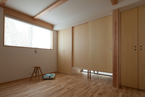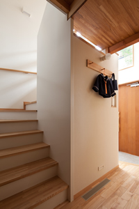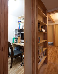 今までの仕事 -三鷹 小春日和の家-05 一階には寝室と書斎があります。 研究者であるご主人は家でも仕事をするので、書斎は完全に籠れる部屋になっています。 家族が寝ていても、電気を点けて好きな時間に使えるような場所。小さく細長いコックピットです。 一階から二階に抜けて行くルートには、フックをつけたり棚を設置して通路以上の機能をもたせました。 寝室は反対側に押し入れがあって、布団が片付くので他の用途にも使えます。 ヨーガのインストラクターでもある奥さんは、ここで朝一番にヨーガも。 クローゼットも充実のサイズ。