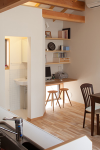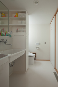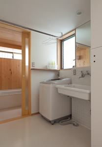 今までの仕事 -三鷹 小春日和の家-06 一階にトイレと洗面と脱衣と洗濯場を兼ねた大きな水まわりがあって、その奥にお風呂。 二階にもトイレと手洗いがあります。 機能的に入れものを付属させているので、非常にすっきり。 掃除がしやすくて、清潔。太陽熱を利用したお湯を使えるので、夏の暑さもありがたい! 洗面場の床にもスリットが切ってあって、冬も太陽の温かい空気が入ってきて快適なのです。