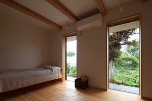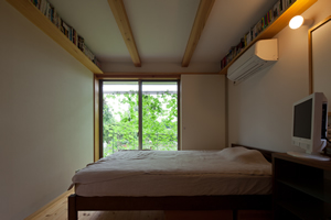 画像:上左 そのうち分割する子供室。 中庭に面していて気持ちいい。 画像:下左 夫婦の寝室。 不規則な時間に寝るので 遮光できるような襖戸を。 鴨居にはコレクションのコミック。 ずらっと揃った様子は圧巻。