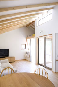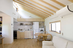 画像:上左 構造がそのままデザインです 。 めずらしく一列のキッチン。 洗濯機も並んでいます。 効率と選択です。 画像:下左 階段の上に小屋裏。 荷物も置けるし、秘密基地にも。