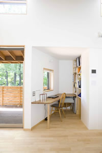 今までの仕事 -小平 緑の前の家-04 二階はみんなの場所。 集まってご飯を食べる。くつろぐ。みんなの書斎もあって、台所に付属する食器食品庫もあります。 この住宅は全部で69u。21坪しかありませんが、広いでしょ。目線の抜けや空間のボリューム。 家族が大事にしてることが真ん中にあって、それでいい。 元気で一緒に居られる時間が一番大事。 外でご飯を食べることが出来るサイズのデッキテラス。おにぎり食べるだけでしあわせ。