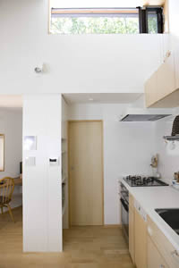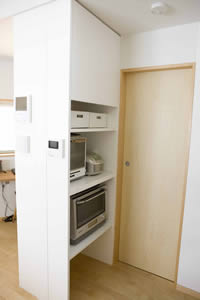 今までの仕事 -小平 緑と川の前の家-06 二階の台所の奥。台所は一列ですべて見えています。そうなると少々バックヤードがほしい。 見えない部位で家電が置けたり、食器や食品が収まる場所を計画します。それが生活のリアルです。 家電の棚は湯気が抜けるように引き出せます。家電のサイズが変わっても対応できる程度のざっくりさ。 画像の下は防犯の面格子。オリジナルで製作しています。既製品で構成されるところを手でつくっています。 創り手が居て、住み手が居て、設計者が居る一期一会のチームワークです。