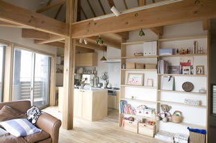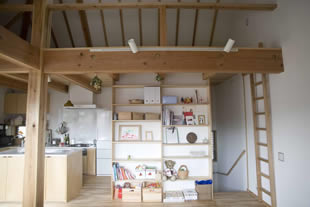 画像:下左 みんなの場所から見上げると 小屋裏と繋がってます。 おもちゃや本を置く場所もつくって 楽しい生活の様子。