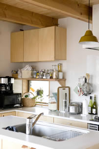 画像:上左 みんなが集まる場所からキッチン方向 台所は空間の一部。 画像:上右 台所に生活の道具があっても 住み手そのままで気持ちいい。 美味しいご飯が出来そうです。