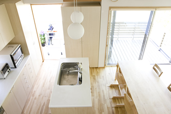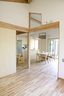今までの仕事 -山梨 100K先のプロヴァンス-04 そもそもこの住宅を建てる前は、父上の仕事の道具を置く倉庫がありました。そんな経緯から一階にはそんな場所を付属させています。 そんな要素を入れるときに、時間の経過とともに使い方を見直す住宅にしようと決めました。 子供が小さなうちは皆で寝る。そのうち個室が必要になって、その後また違う使い方になる。 将来をざっくりシュミレーションして部屋の用途を限定せず、あるときは子供の場所、あるときは炬燵に入る茶の間…という想定をしています。 二階の一部は今は茶の間のような想定。時期が来たら夫婦の寝室や子供の場所に順次変わります。住宅ってそのくらいのEASYさが必要ですね。