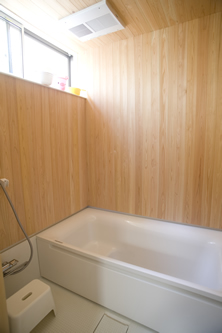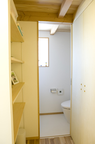 画像:上左 ハーフユニット+檜。 寒さの想定で浴室暖房乾燥機。 画像:上中 洗濯・洗面と真ん中に収納。 風呂場へは引き戸です。 画像:上右 一階のトイレは引き戸で。 閉めたいときに閉めます。 画像:下左 二階のトイレ・手洗い。 みんなが居る場所からは ずっと奥なので落ち着いています。 こっそり入って恥ずかしくないように。