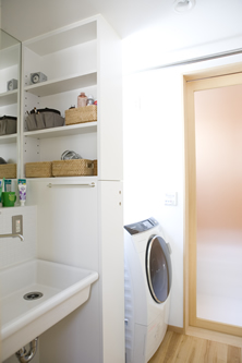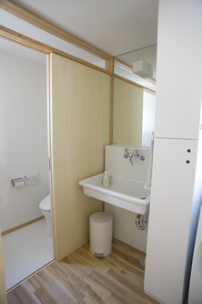 今までの仕事 -山梨 100K先のプロヴァンス-07 水まわりです。一階に風呂場と洗面と洗濯場とトイレ。二階にもトイレ+手洗い場があります。 いつも大抵同じようにつくります。引き戸+適宜な収納+排水の床部分は見えるように+白+檜とハーフユニットバス。 家族によって、そのバランスと並びと窓や繋がりが少しづつ違う。半年経って撮影に伺いましたがピッカピカで優秀。ずっとガンバレ。