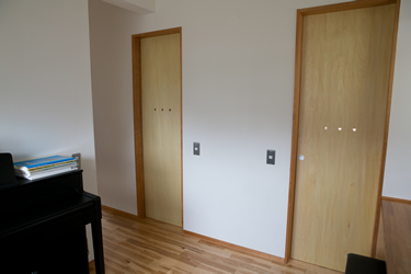 二階は個室の前に、みんなで使える書斎があります。ピアノもあって、本棚やパソコンもある。